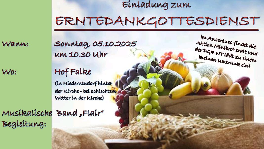 📢 Einladung zum Erntedankgottesdienst 📅 Sonntag, 05.10.2025, 10:30 Uhr 📍 Hof Falke (Niederntudorf, hinter der Kirche – bei Regen in der[…]